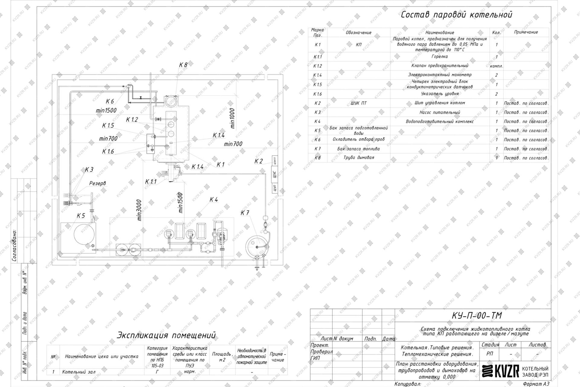 Чтобы правильно подключить мазутный паровой котел 1500 кг / 1.5 т пара -115 °С -0,07 МПа / 0,7 кгс/cм² в котельной необходимо оставить проемы для обслуживания оборудования во время эксплуатации. На представленной здесь схеме обозначены их размеры. Кроме того, в данной примерной схеме монтажа паровых котлов и оборудования указан перечень минимально необходимого вспомогательного оборудования.