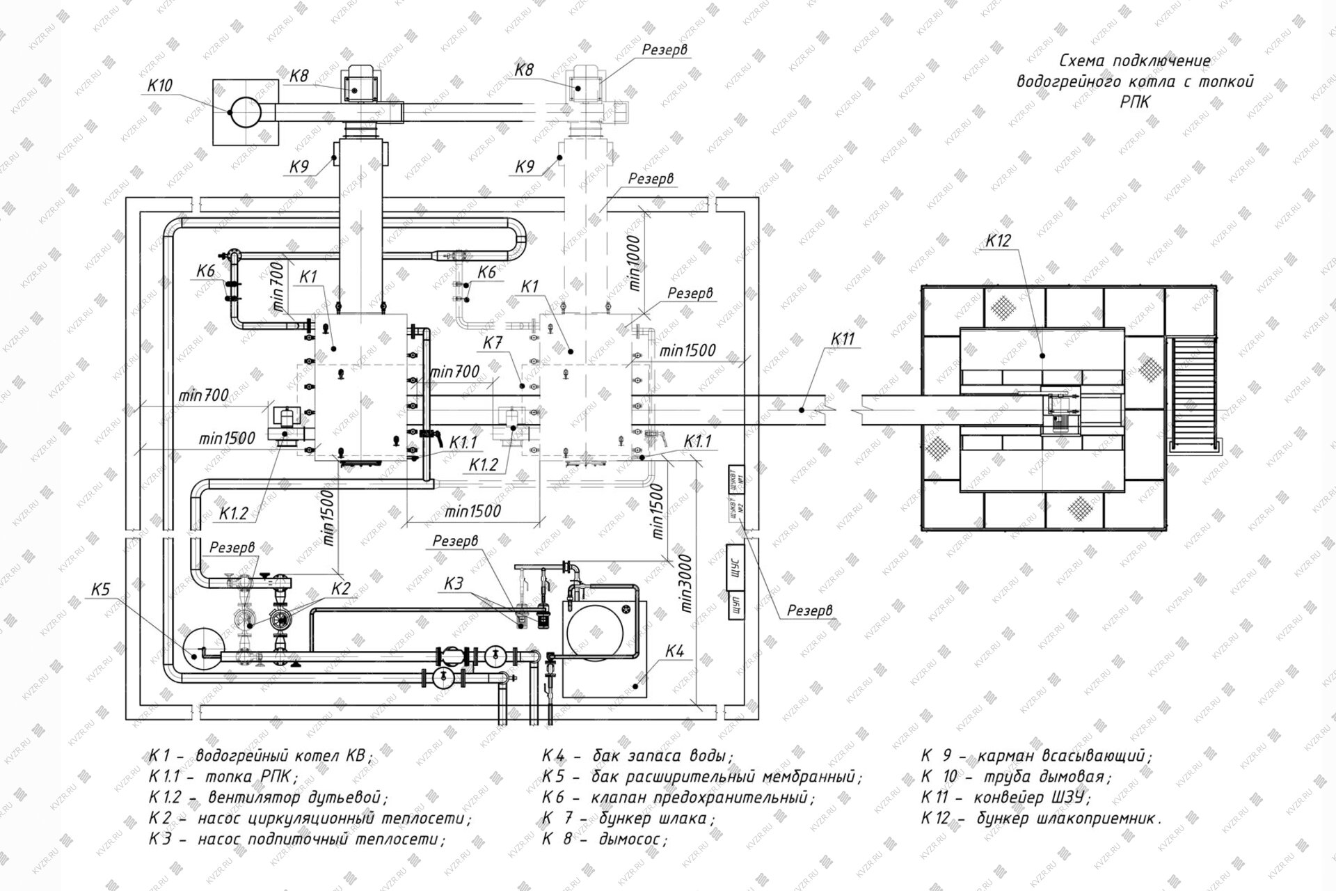 Чтобы правильно подключить котел КВм-0.7 с топкой РПК в котельной необходимо оставить проемы для обслуживания оборудования во время эксплуатации. На представленной здесь схеме указаны их минимальные размеры. Кроме того, в данной примерной схеме монтажа водогрейных котлов и оборудования указан перечень минимально необходимого вспомогательного оборудования для правильной работы котла.