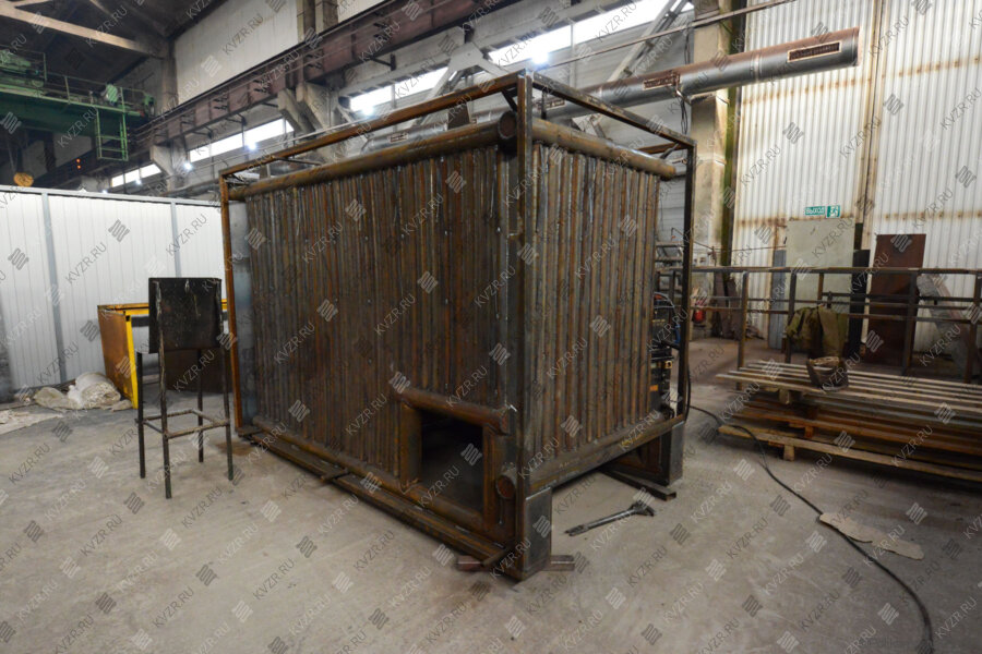 Блок водонагревательного котла КВм 0,8 МВт представляет собой горизонтальную стальную сварную конструкцию, состоящую из трубной системы (радиационной и конвективной поверхности нагрева), опорной рамы и каркаса с теплоизоляционными материалами, обшитого листовой сталью. Топочная камера состоит из труб Ø 57x3,5 мм. Конвективная поверхность нагрева состоит из пакетов выполненных из труб Ø 32x3 мм, для интенсификации теплообмена трубы пакетов расположены в шахматном порядке.