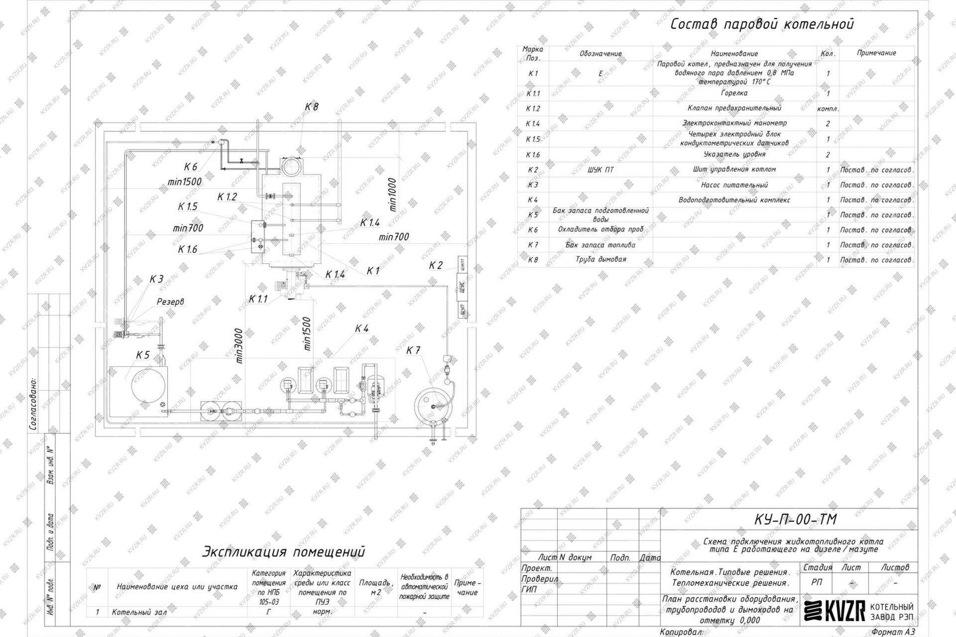 Энергоэффективный дизельный паровой котел 2000 кг / 2 т пара -130°С -0,17 МПа / 1.7 кгс/cм², предназначен для получения насыщенного пара для технологических целей в производстве. Устанавливается в производственных и промышленных котельных.